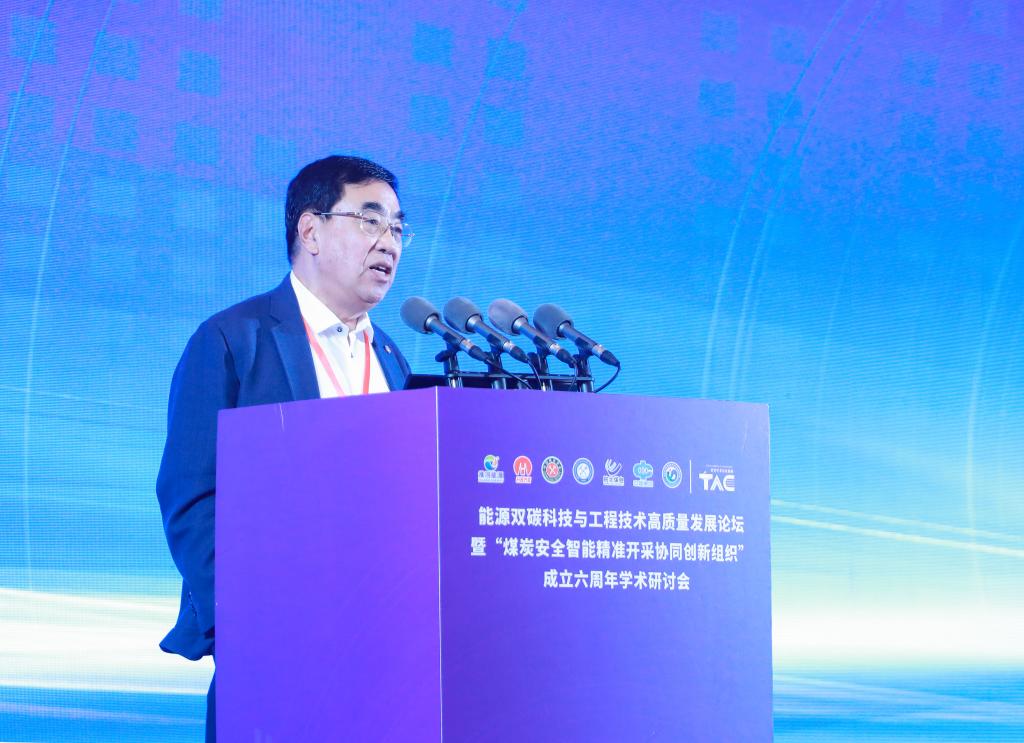 谢克昌院士致辞。他指出,绿色碳中和能源转型是一个大趋势,但能源转型进程中的安全问题已成为世界焦点,煤炭兜底保障作用无可替代地成为能源安全供给的重要支撑。因此,能源的双碳目标必须要以保障国家能源安全为前提。党的二十大报告要求“深入推进能源革命,加强煤炭清洁高效利用,加大油气资源勘探开发和增储上产力度,加快规划建设新型能源体系”。煤炭安全智能精准开采不仅对新型能源体系建设而且对我国经济社会的可持续发展具有重大意义,但由于我国的煤炭储藏特点和煤炭本身属性,无论精准开采还是高效利用,还有许多有待突破的理论问题和技术瓶颈。谢克昌院士深信各位与会的院士专家在充分发挥由安徽理工大学等单位共建的“煤炭安全智能精准开采协同创新组织”这一平台的作用并通过本次论坛的学术思想和研究成果交流,聚焦前沿热点,针对问题瓶颈,互通有无,协同创新,一定会为能源双碳科技与工程技术发展、煤炭安全智能精准开采作出更大贡献。